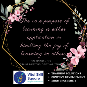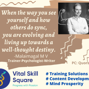 Vital Skill Square is the passionate brain-child of Malaimagal M V, Founder & Director, incepted with it’s nimble foot prints 2018 as the Training Vendor of 2 giant banners of the respective industry, Apollo Tyres Ltd., & Computer Age Management Services Ltd. (CAMS).